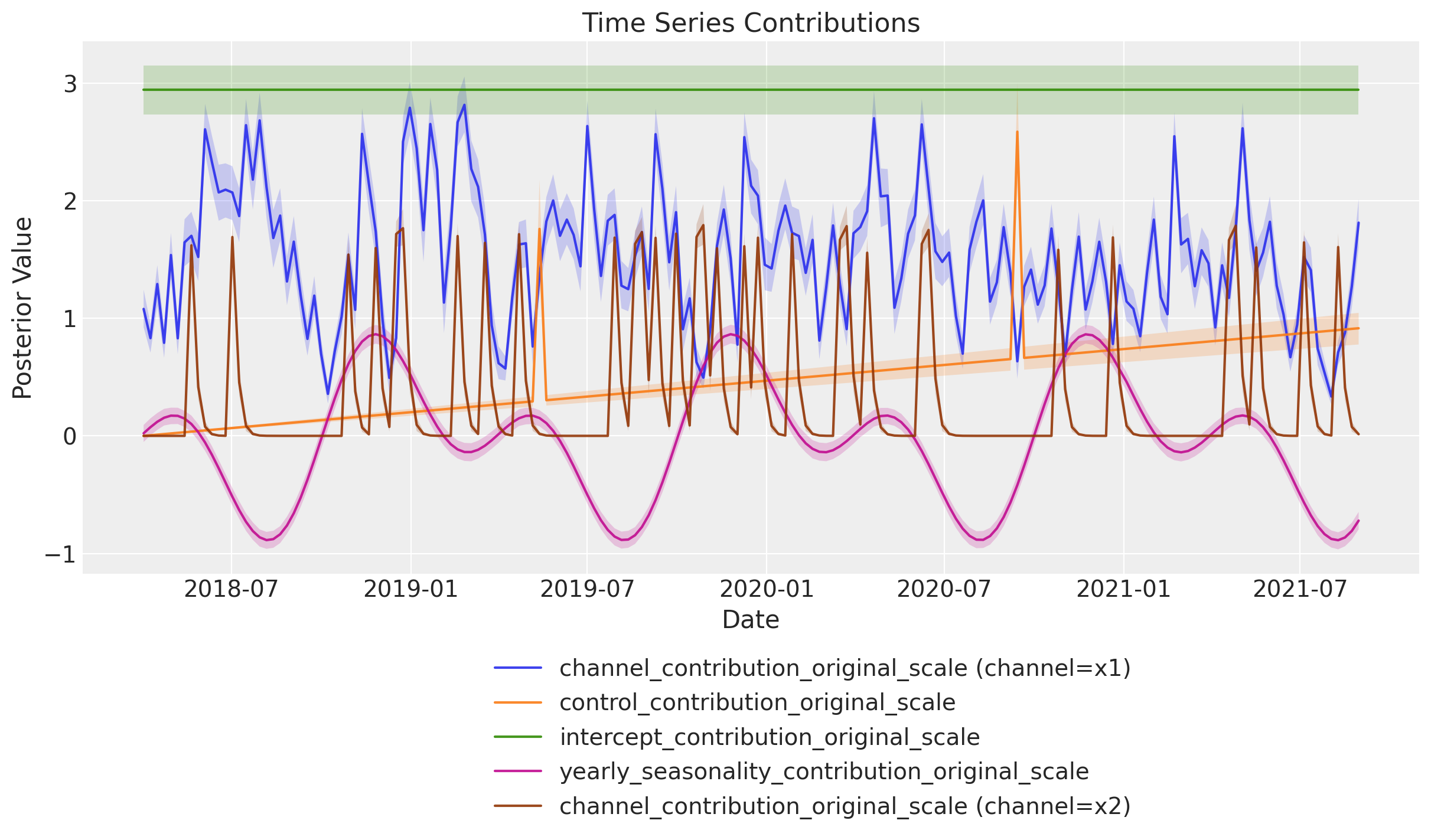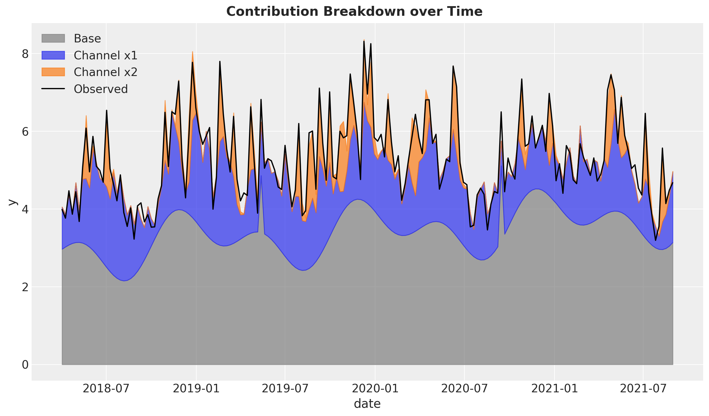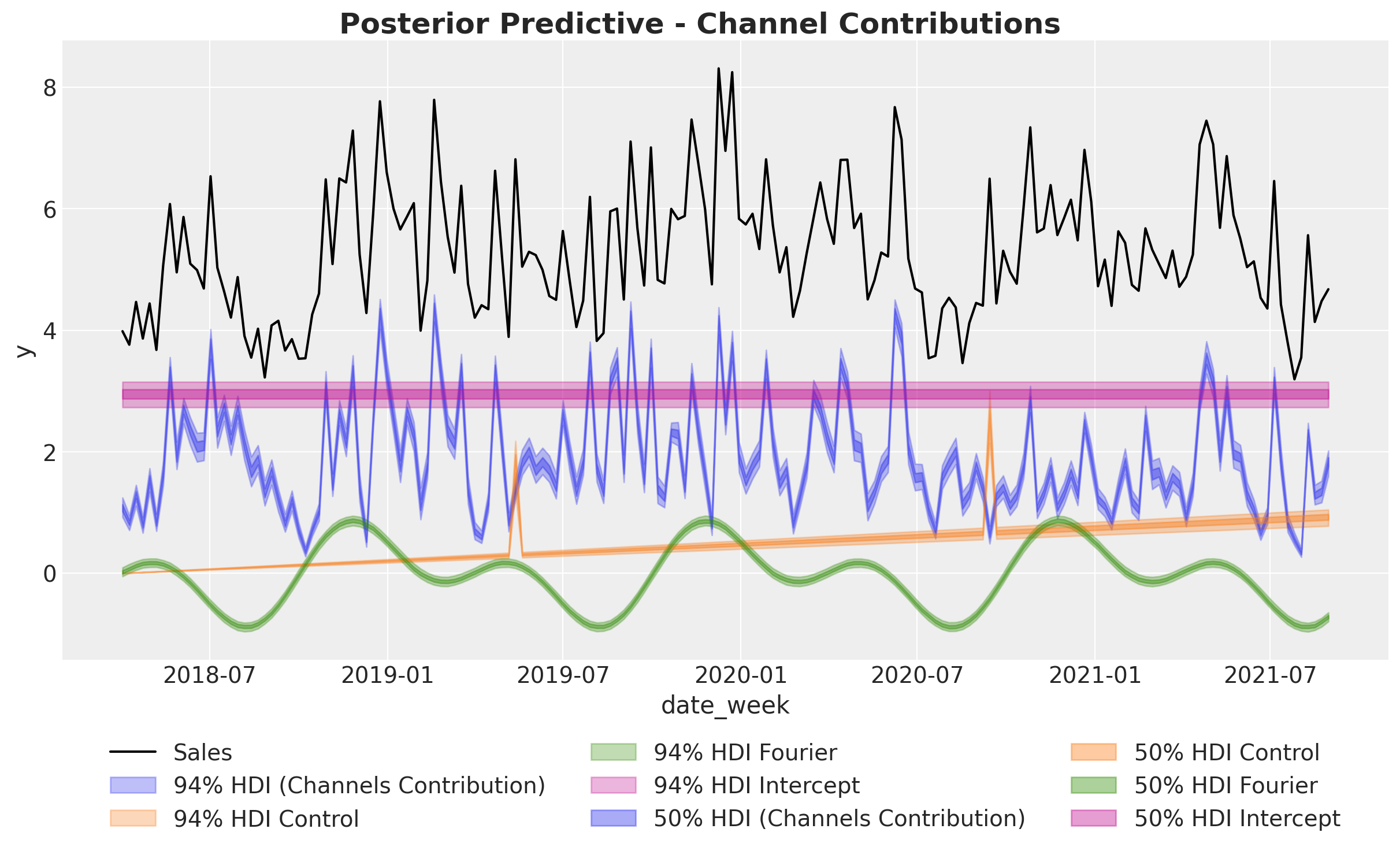 Time-varying Intercept: Capture time-varying baseline contributions in your model (using modern and efficient Gaussian processes approximation methods). That is, we allow the intercept term \(\alpha = \alpha(t)\) to vary over time. See mmm_tvp_example.