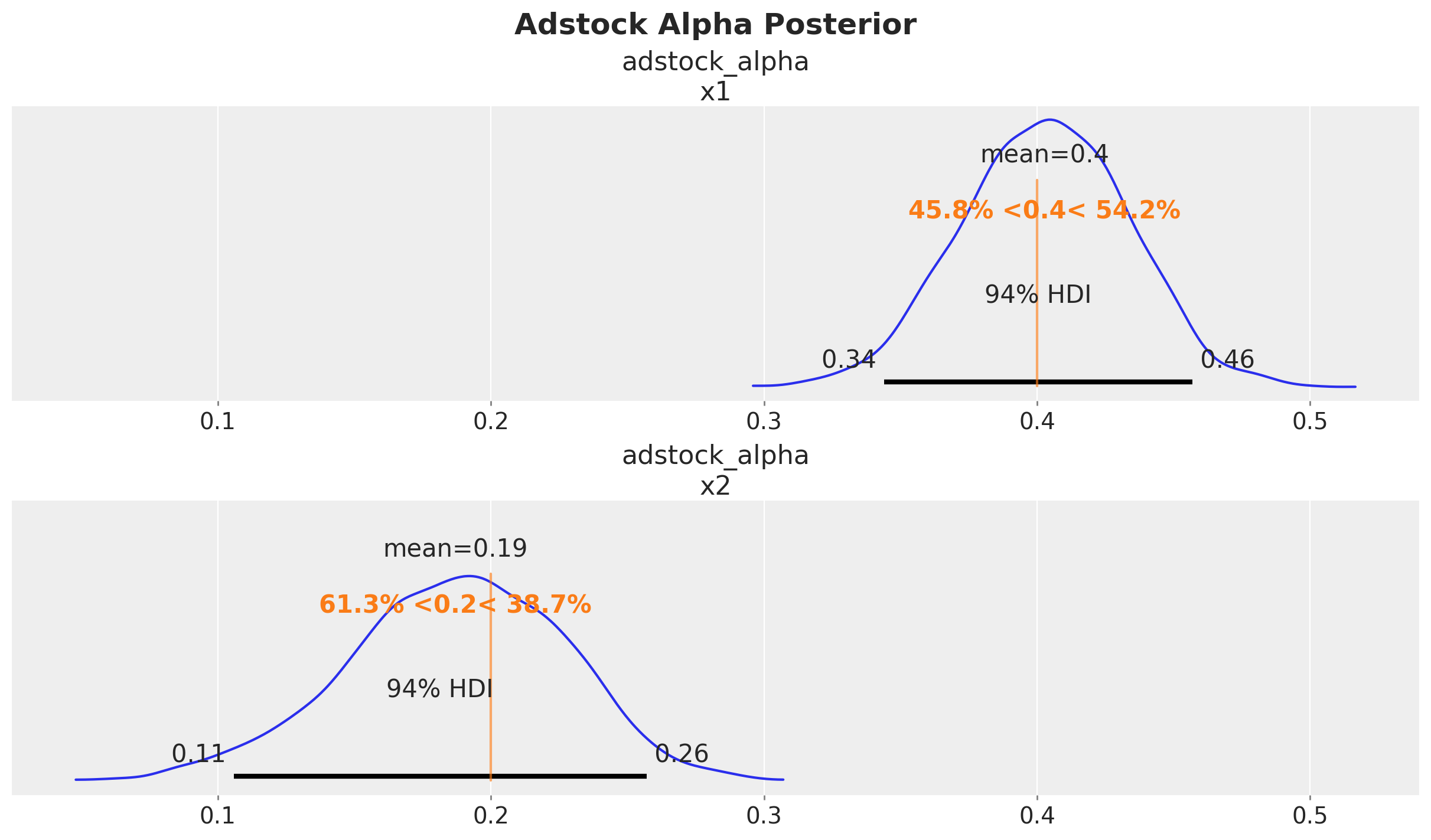 Let’s start with the adstock transformation. We set the adstock parameter \(0 < \alpha < 1\) to be \(0.4\) and \(0.2\) for \(x_1\) and \(x_2\) respectively. We set a maximum lag effect of \(8\) weeks.